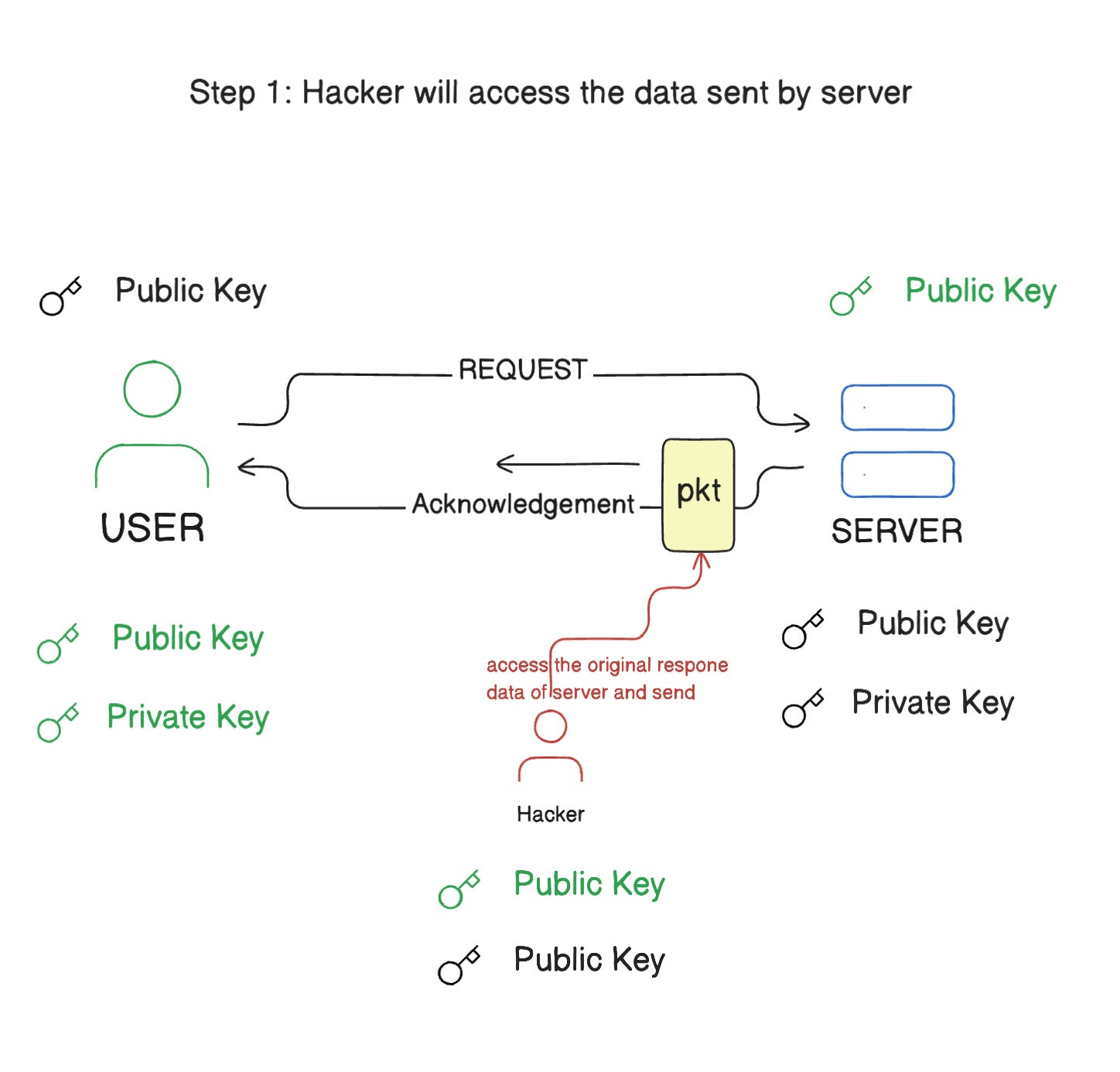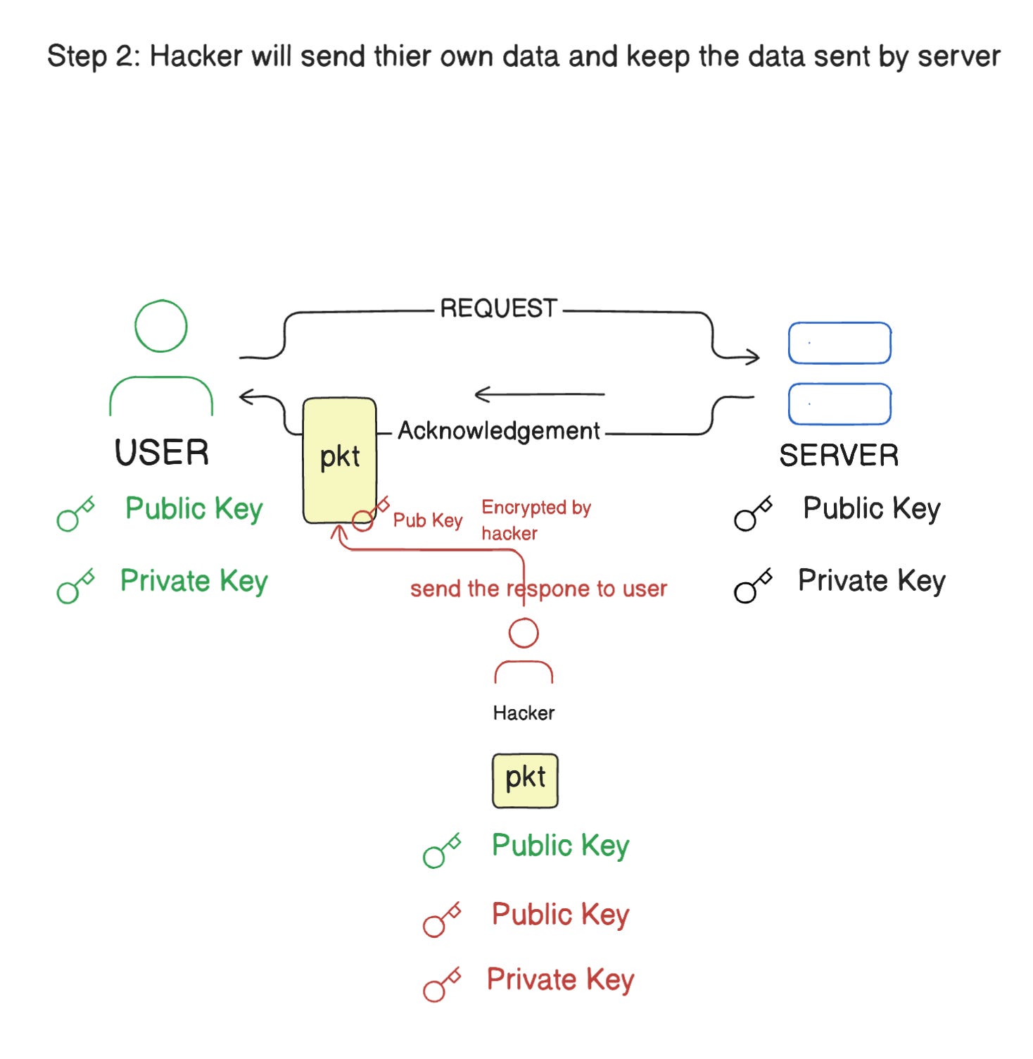 What happened here is that, when a request is sent by the client, it is encrypted with the client's public key and can only be decrypted by the corresponding private key. In this scenario, an unauthorized system intercepted the request and obtained a copy of the client’s public key. When the server acknowledges the request and sends a response, the unauthorized system intercepts the response, obtains the server's public key, and replaces it with its own public key before sending the response packet to the client. By doing this, the unauthorized system acts as an intermediary between the client and server, accessing, forwarding, and even manipulating the data.